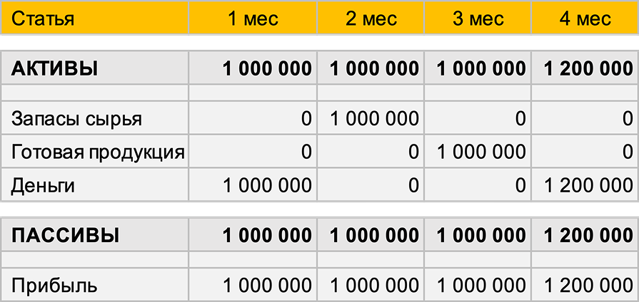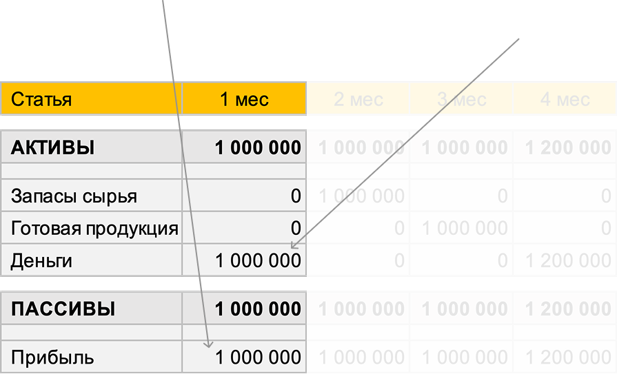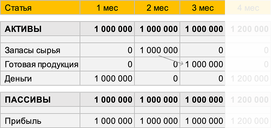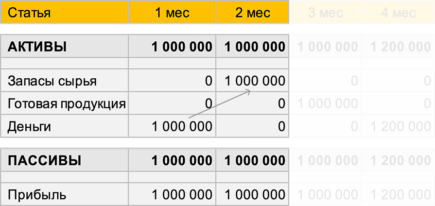 Во 2 месяце на эти деньги вы закупаете сырье. Ровно на 1 млн ₽.