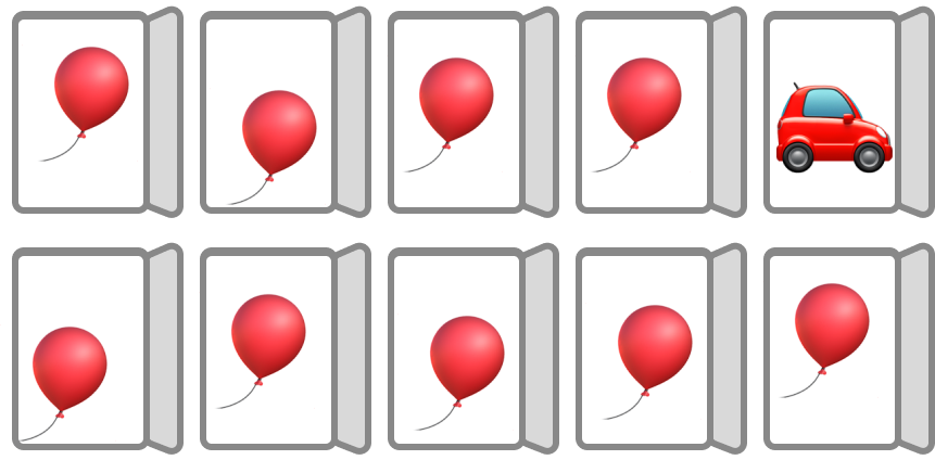 Проще рассуждать на примере из 10 дверей. За одной все также автомобиль, а за остальными — воздушные шарики.