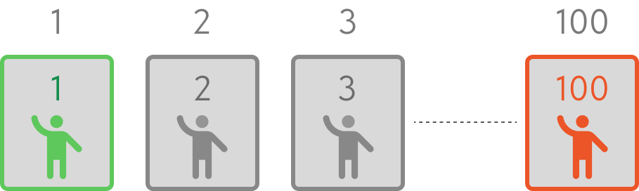 Все последующие зрители садятся также на свои места, ведь они свободны, включая последнего зрителя — он занимает своё место №100.