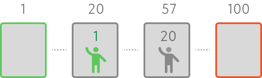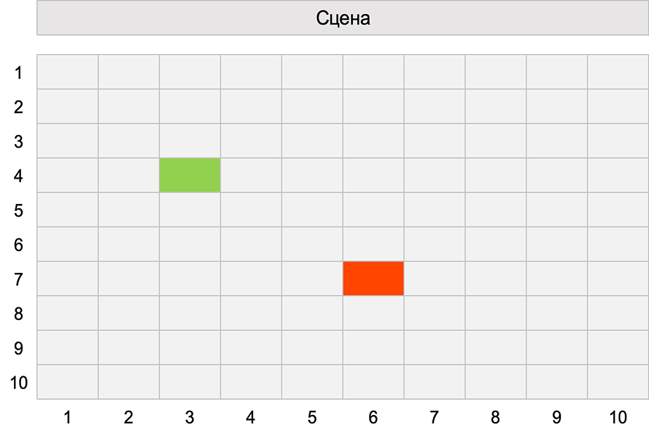 Зритель 1 выбирает кресло №20 (или любое другое от 2 до 99), зрители с 2 по 19 займут свои места, т.к. они свободны.