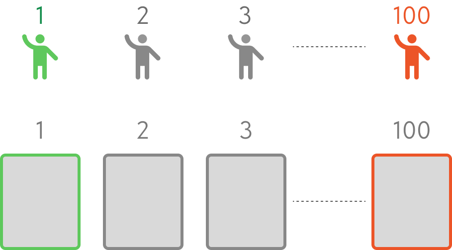 Зритель 1 выбирает кресло №100, второй и последующие зрители займут точно свои места, ведь они свободны. А последний зритель 100 увидит, что его место занято и займет чужое место №1.