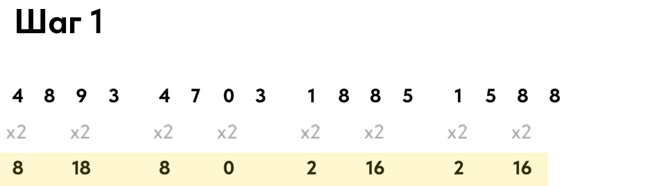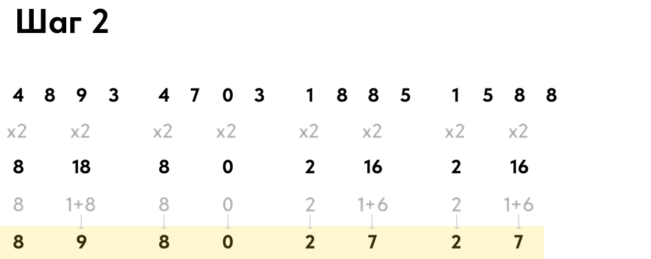 1. Возьмите номер вашей карты и умножьте каждую нечетную цифру на 2.