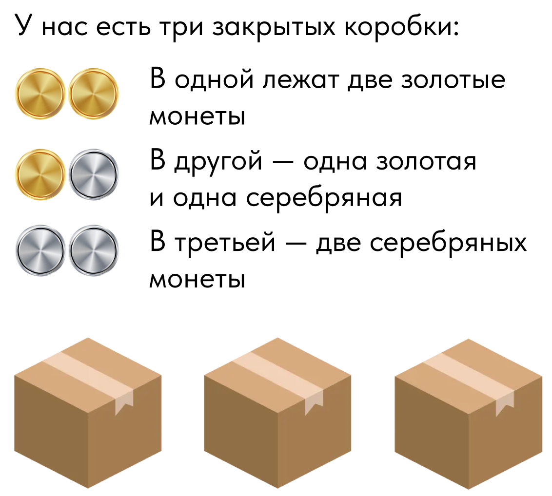 Вспомните про два прошлых парадокса и подумайте: какова вероятность того, что вторая монета в выбранной вами коробке также золотая?