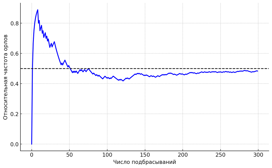 С другой стороны, существует закон больших чисел, который действительно говорит, что по мере увеличения количества подбрасываний монеты относительная частота выпадений орла и решки будет стремиться к 50/50.